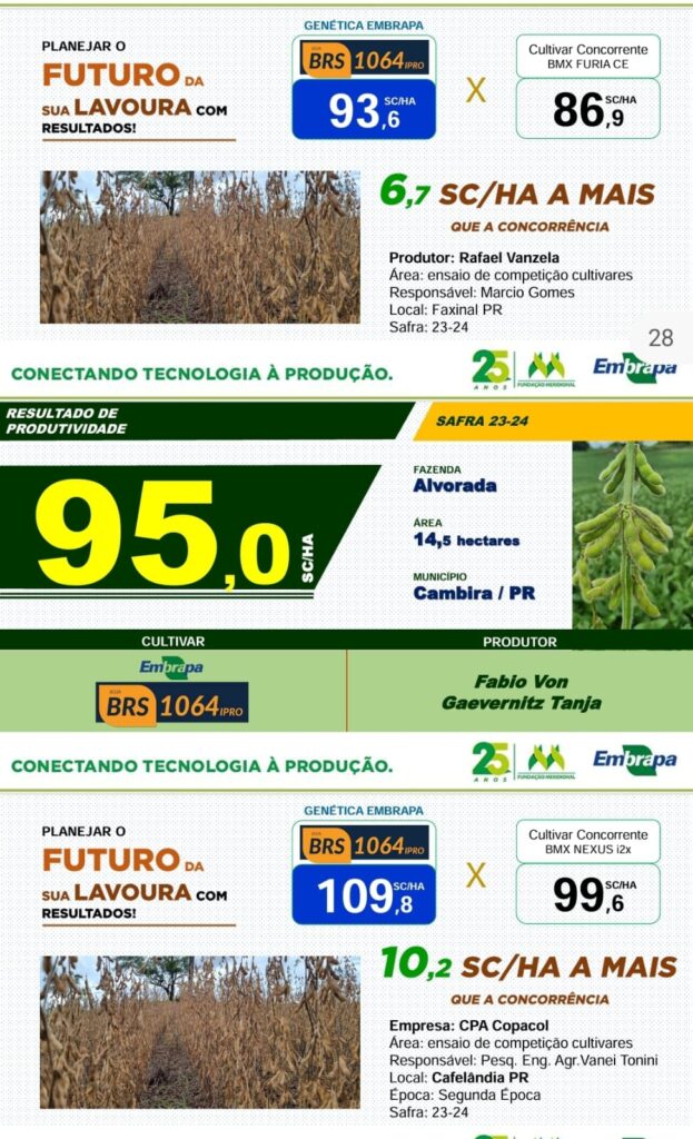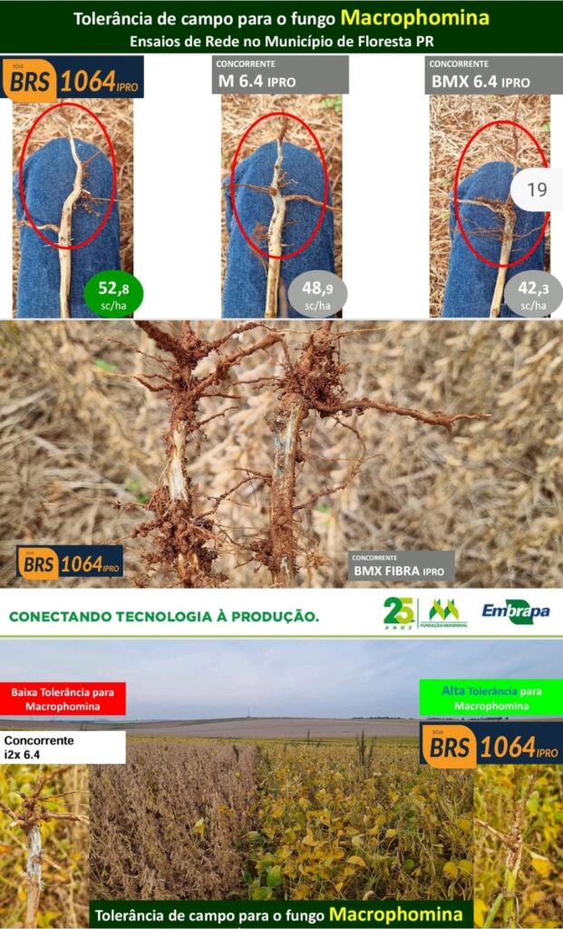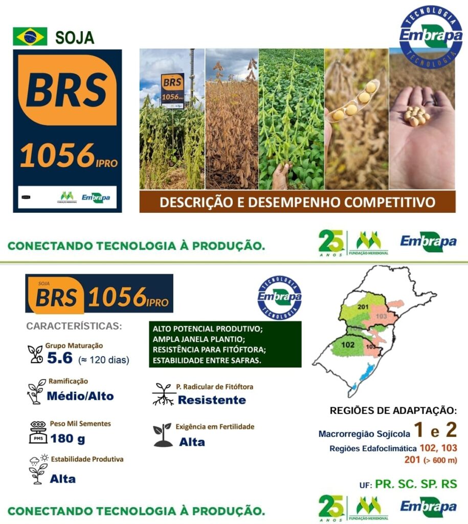 Excelente sanidade radicular, ampla adaptação as regiões indicadas, ótima arquitetura, estabilidade produtiva, excelente potencial de ramificação, porte controlado e resistência ao acamamento.